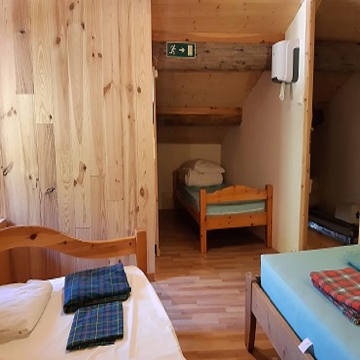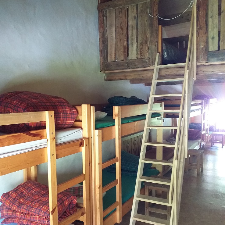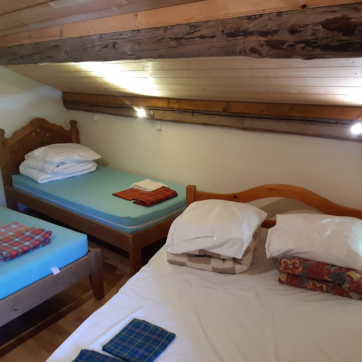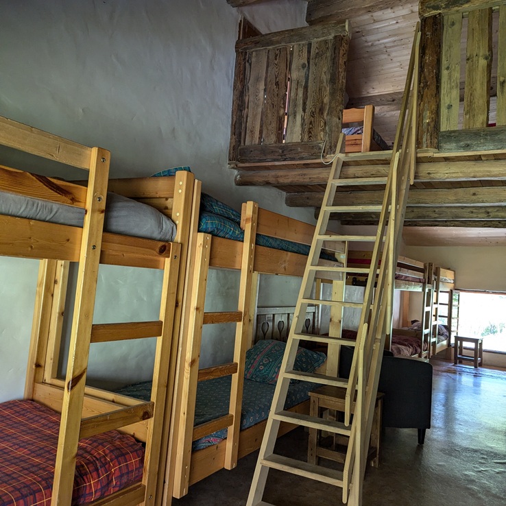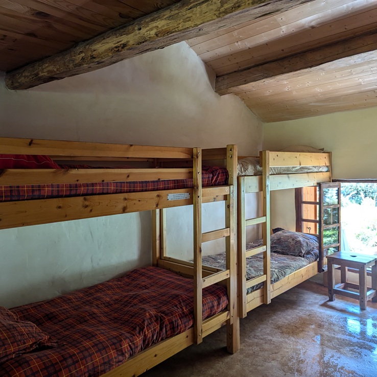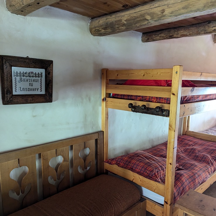 La chambre est plus intime et privée, sans être plus confortable que le dortoir. Les espaces sont compacts, mais tout est là pour une nuit en famille au calme. C’est un hébergement rare en altitude.